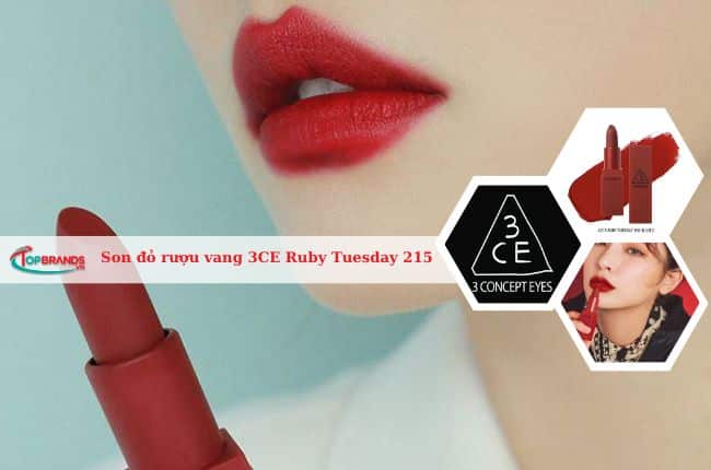 • 3CE Ruby Tuesday 215 với gam màu đỏ ruby đầy quyến rũ, giúp chị em trở nên trẻ trung hiện đại, nhưng vẫn gợi lên được nét đẹp nổi bật trên đôi môi. Sẽ thật gợi cảm nếu bạn sử dụng chúng cho những buổi tiệc theo phong cách cổ điển.